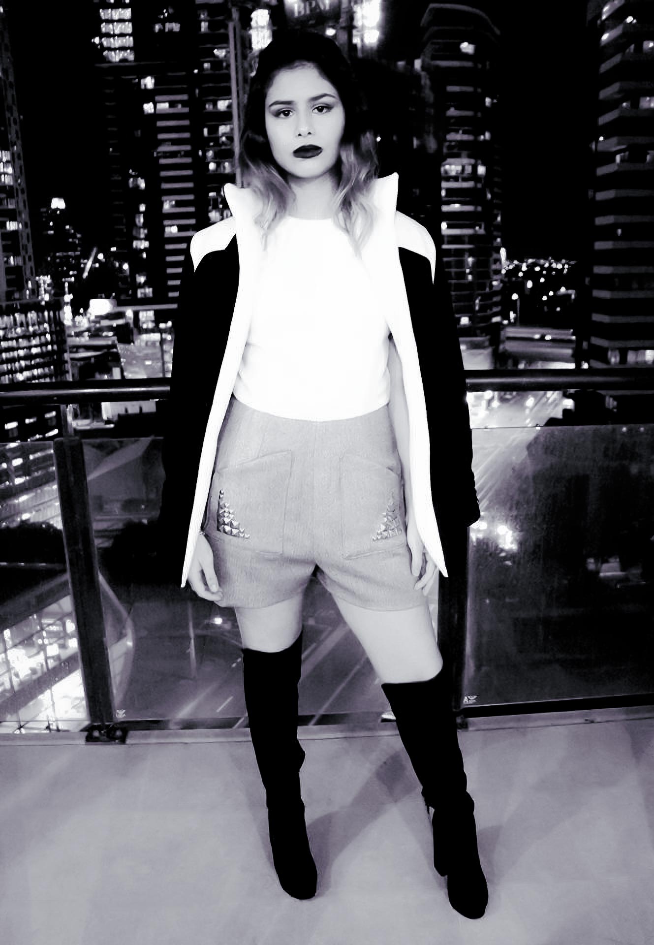 Men's suiting fabrics were chosen for the jacket and shorts of the playsuit to represent male elements. Soft crepe fabric is used in the playsuit top to highlight feminine energy. Straight design lines are made in the jacket for the likeness of the male body, whilst the playsuit silhouette has been shaped with curves suitable to the female body. Boots can be worn by both men and women, but I have chosen them with an emphasis on femininity. Black lipstick adds an out of the ordinary expression to this outfit.