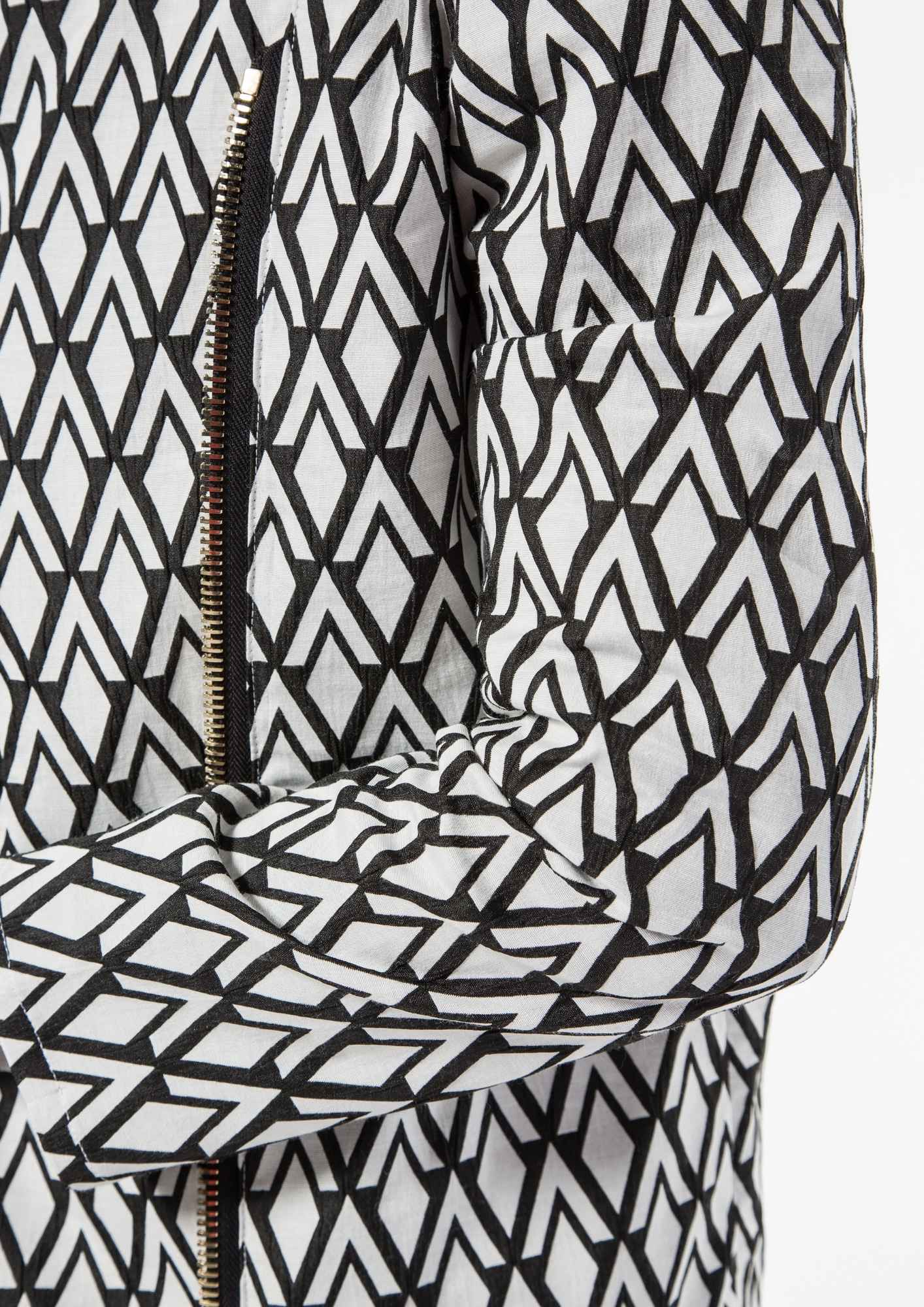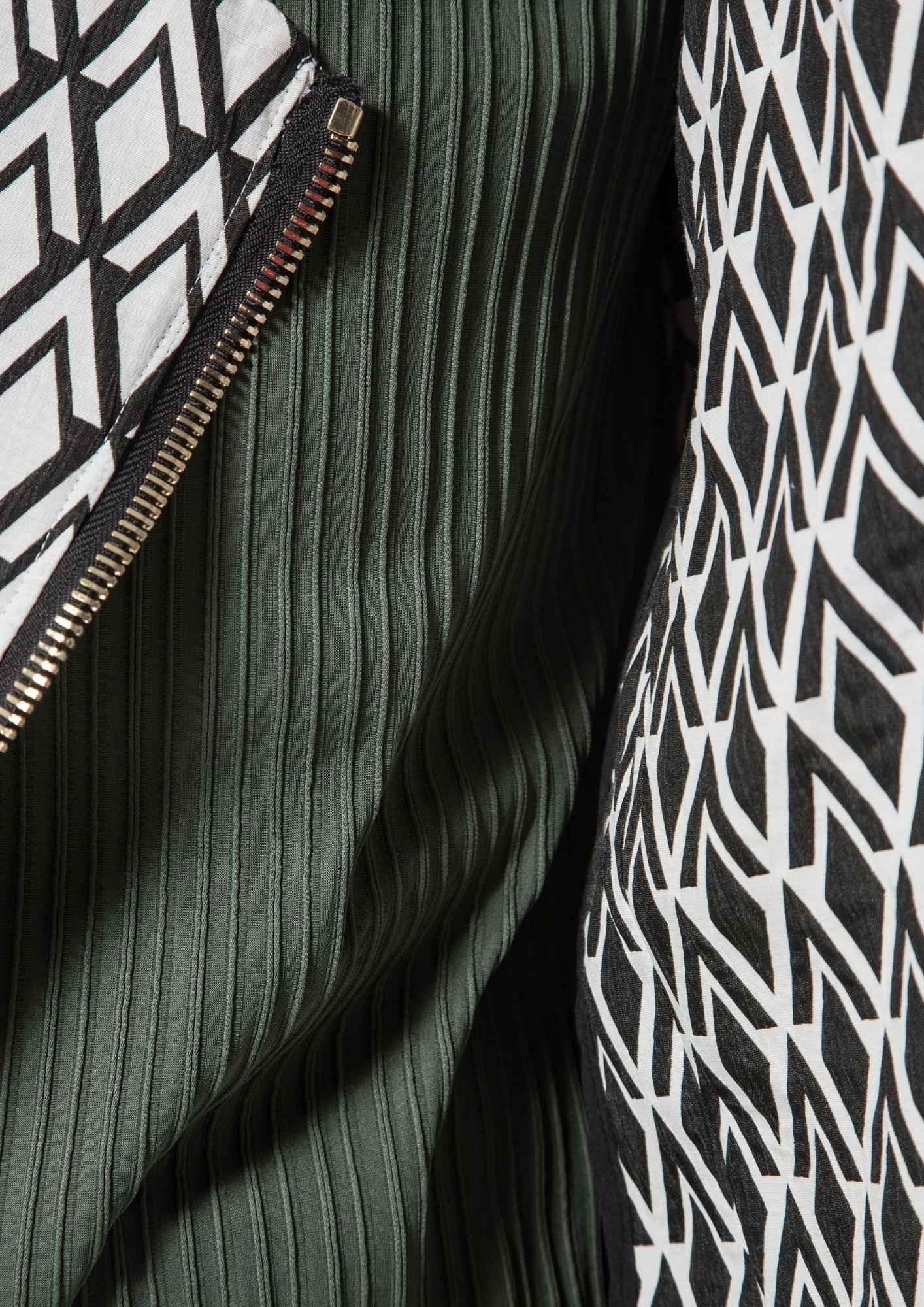 Semi fitted silhouettes combine with pleating elements that are used throughout the jacket and shirt. Curved drapery is constructed along the pant to add a 3D effect. The Jacket design is made with a reservable fabric that can be worn two ways for added versatility. Asymmetric design lines express the modern shapes seen in architecture and invite a contemporary feel.